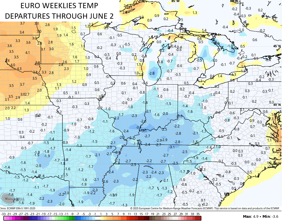 This is cool air in May has been something showing up on the EURO Weeklies for a long time and the new run has the next 32 days showing up cooler than normal…