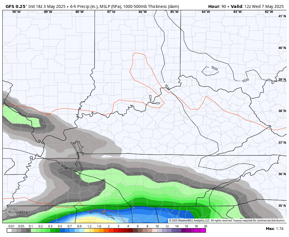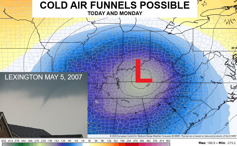 Good Sunday, everyone. Our Derby Day was ugly and that ugly is back with us today and will hang tough for a few more days. A huge upper low is spinning across the region, bringing rounds of chilly showers and even the chance for a few cold air funnel clouds.