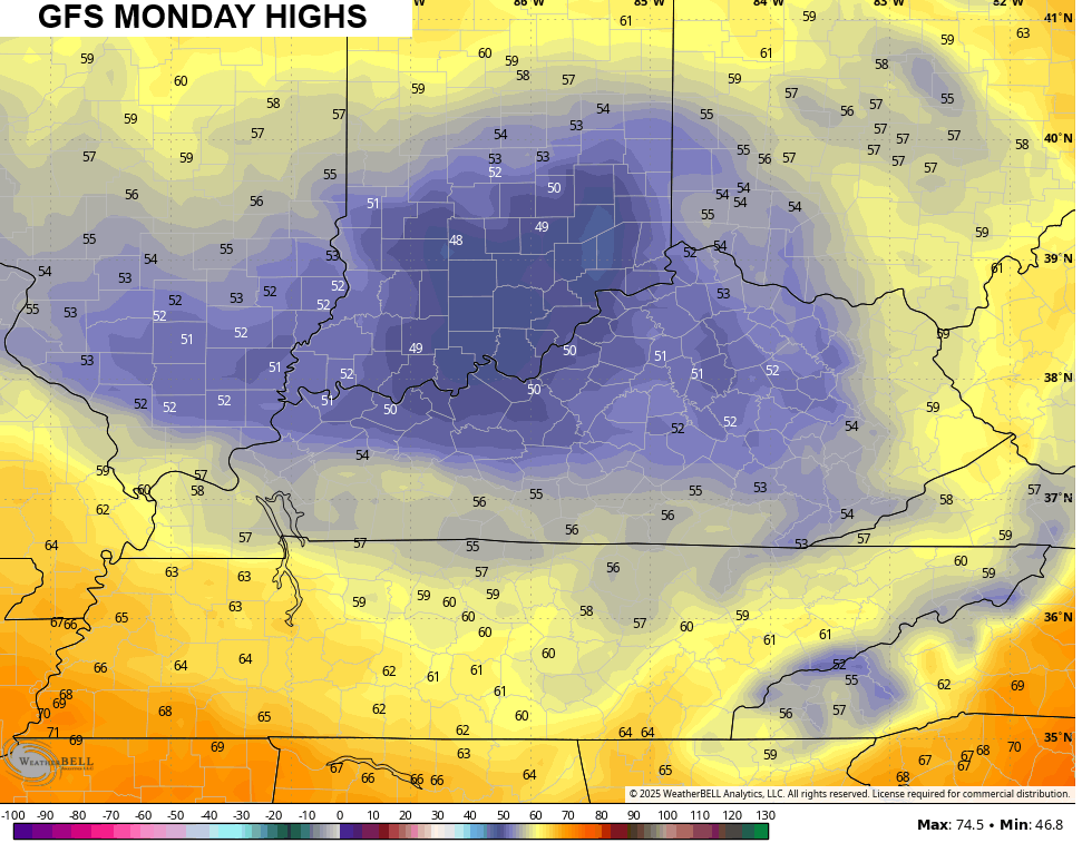Temps today won’t get out of the 50s for many with Monday being even chillier. The GFS is forecasting highs around 50…