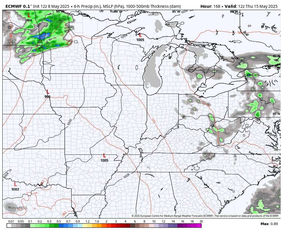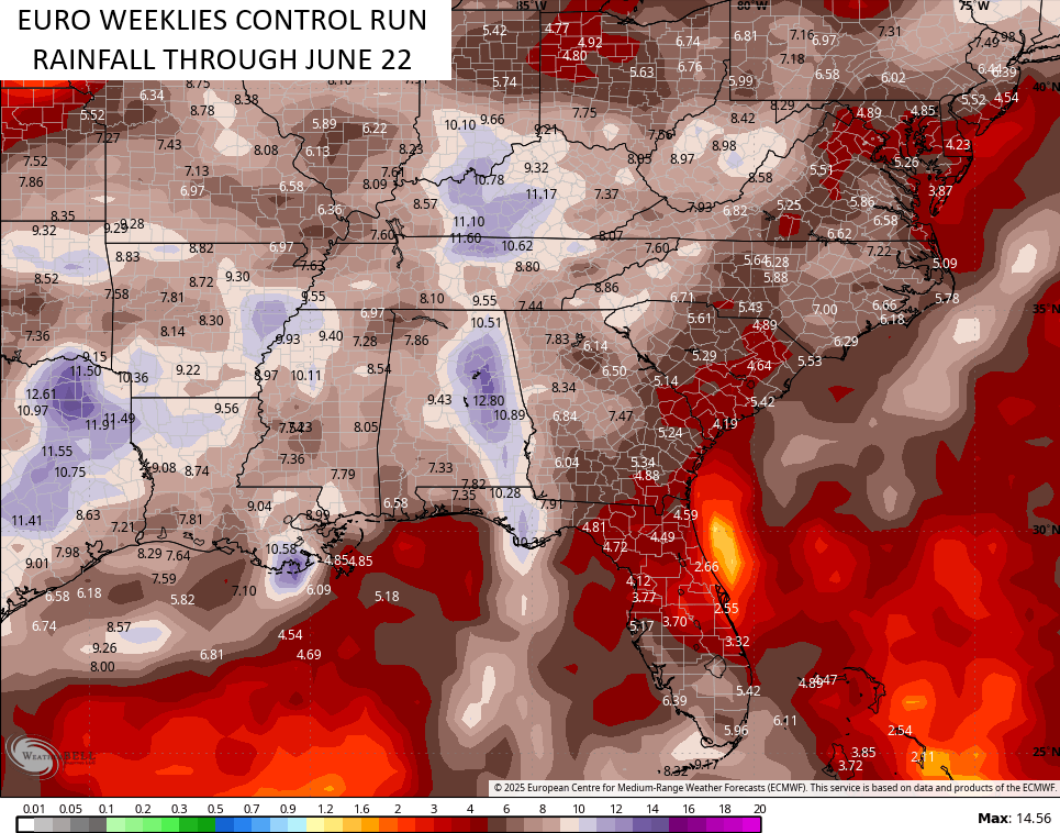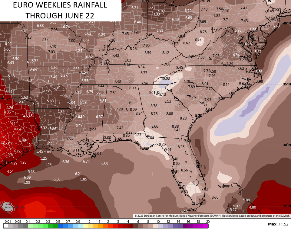 Yesterday, I shared the EURO Weeklies that keep the temps averaging below normal through much of June. This typically comes with ample rainfall and that still appears to be the case on the average of the EURO Weeklies…