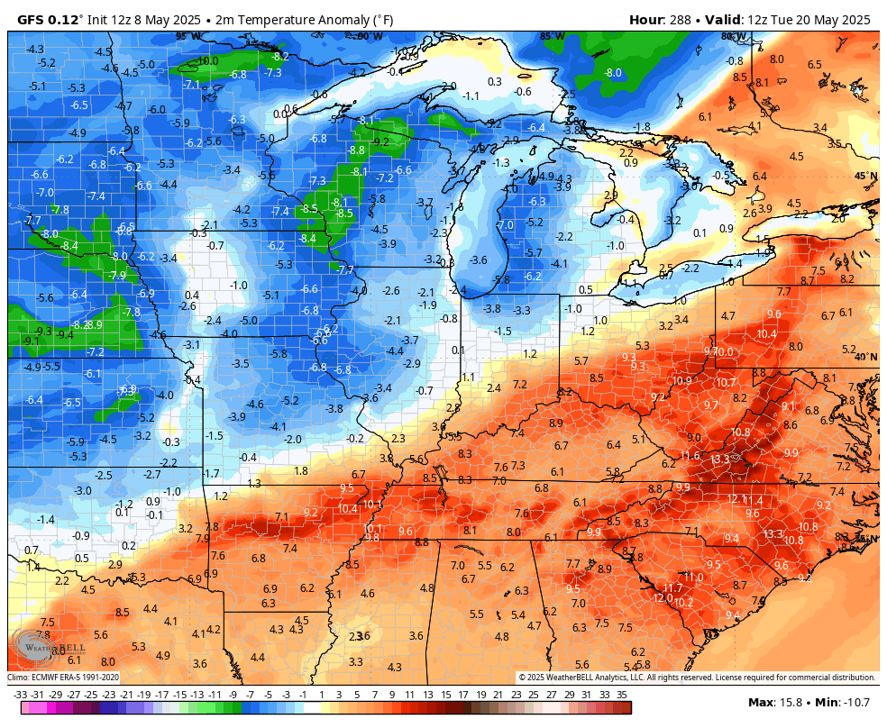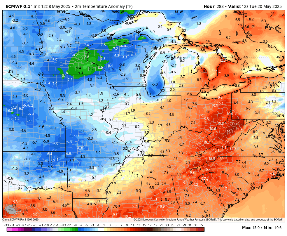 The models continue to point toward this leading us back into a pattern of below normal temps. Here’s the EURO for the week of May 19th…