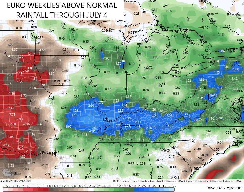 The latest EURO Weeklies now take us through the 4th of July and they see a continuation of this very wet pattern with well above normal rains…