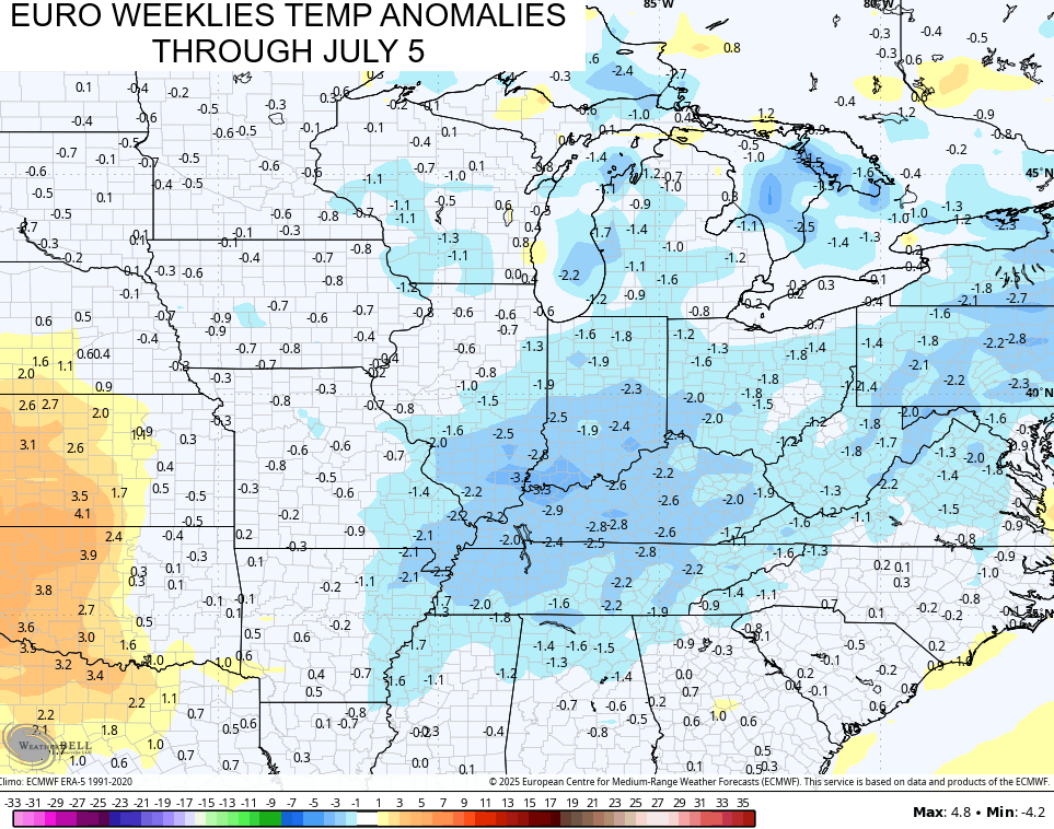 While we will see much warmer weather coming in by the time we hit June, that doesn’t mean temps all of a sudden surge to true summer. The EURO Weeklies show now through July 5th as featuring below normal temps on the whole…