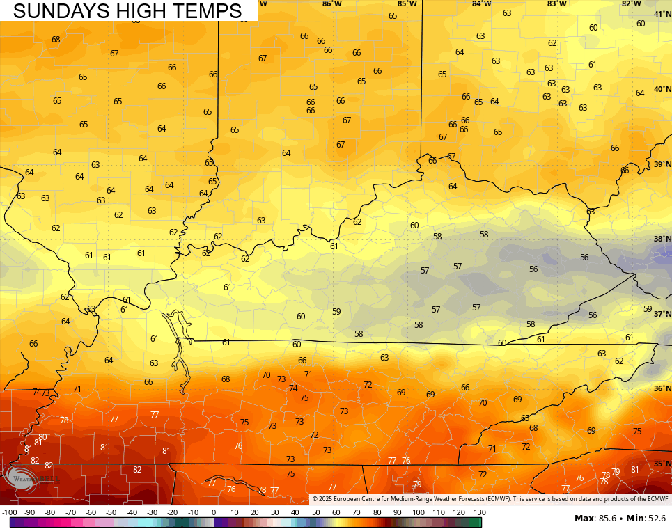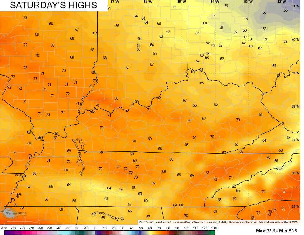Saturday is the best looking day of the bunch with 65-70 across most of Kentucky.