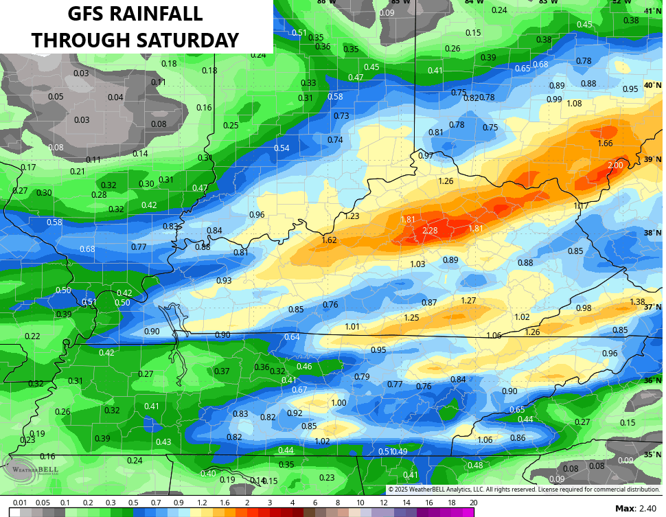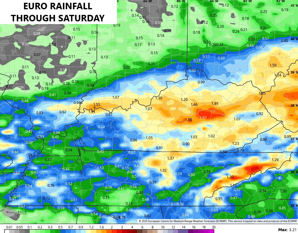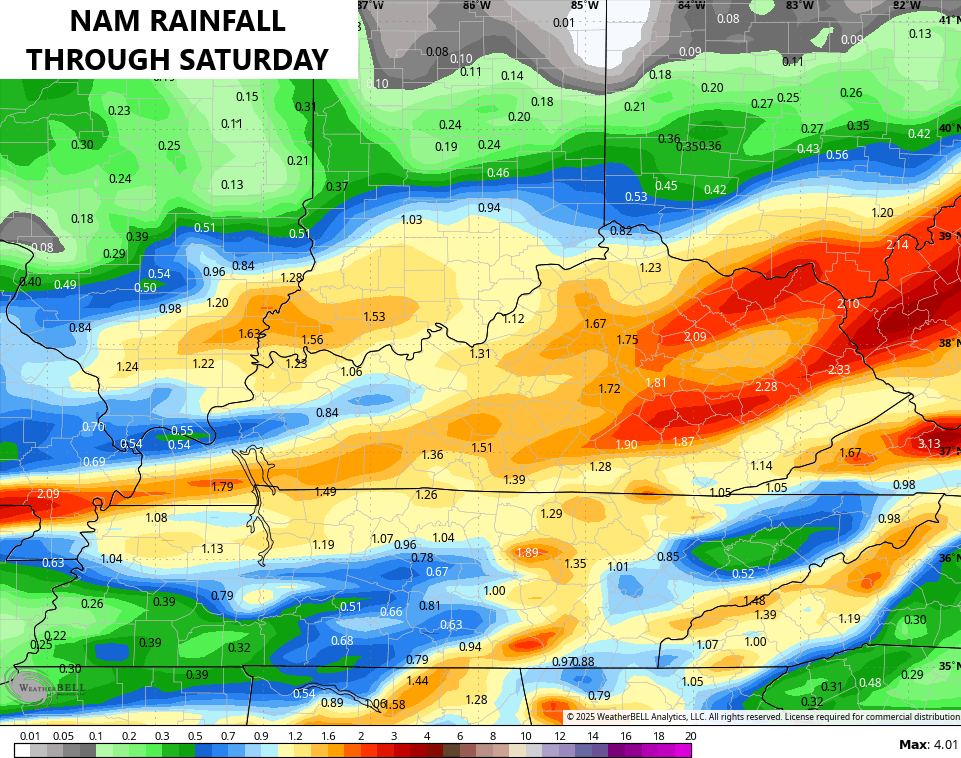 Much of Kentucky will likely pick up 1″-3″ of rain through Saturday. The NAM is most aggressive…