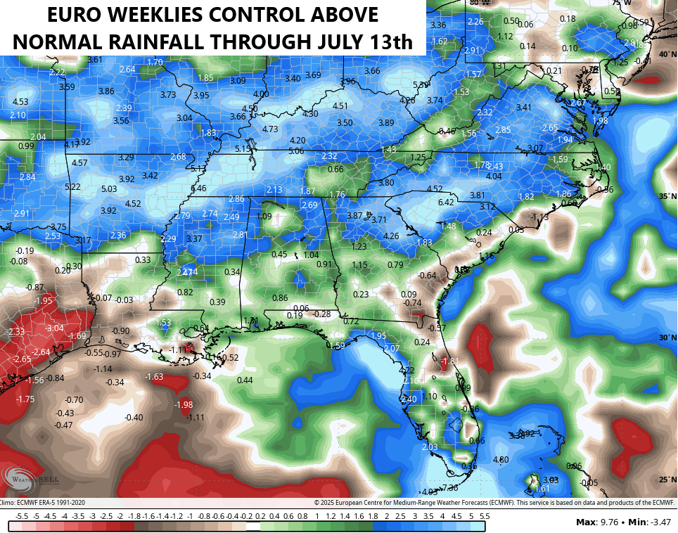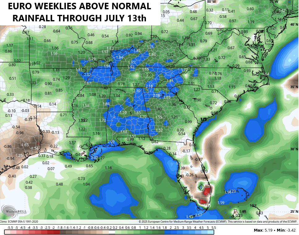 This wetter than normal pattern doesn’t really show any signs of letting up into the first half of summer. The latest EURO Weeklies show Kentucky 1″-3″ above normal into the middle of July…