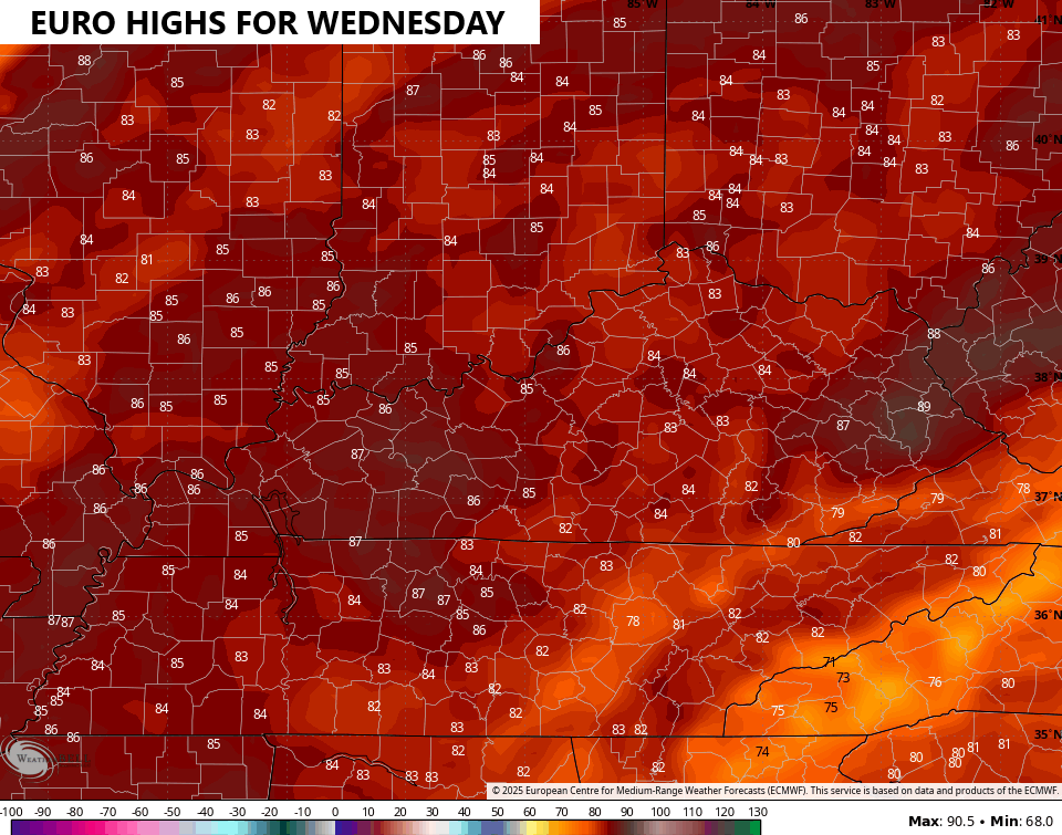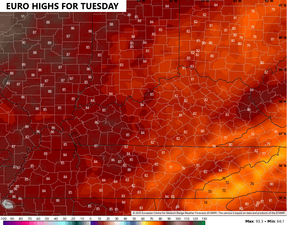 Monday features temps in the low and mid 70s east with 80s in the west. Those 80s then surge eastward across the state for Tuesday and Wednesday. 85-90 may even show up in some areas…
