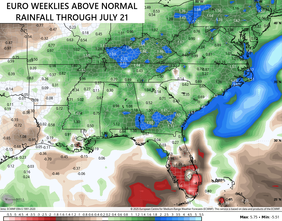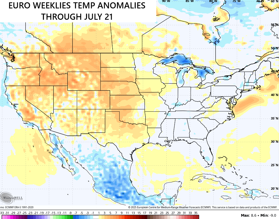 The latest from the EURO Weeklies continues to give us a wetter than normal look through much of July…