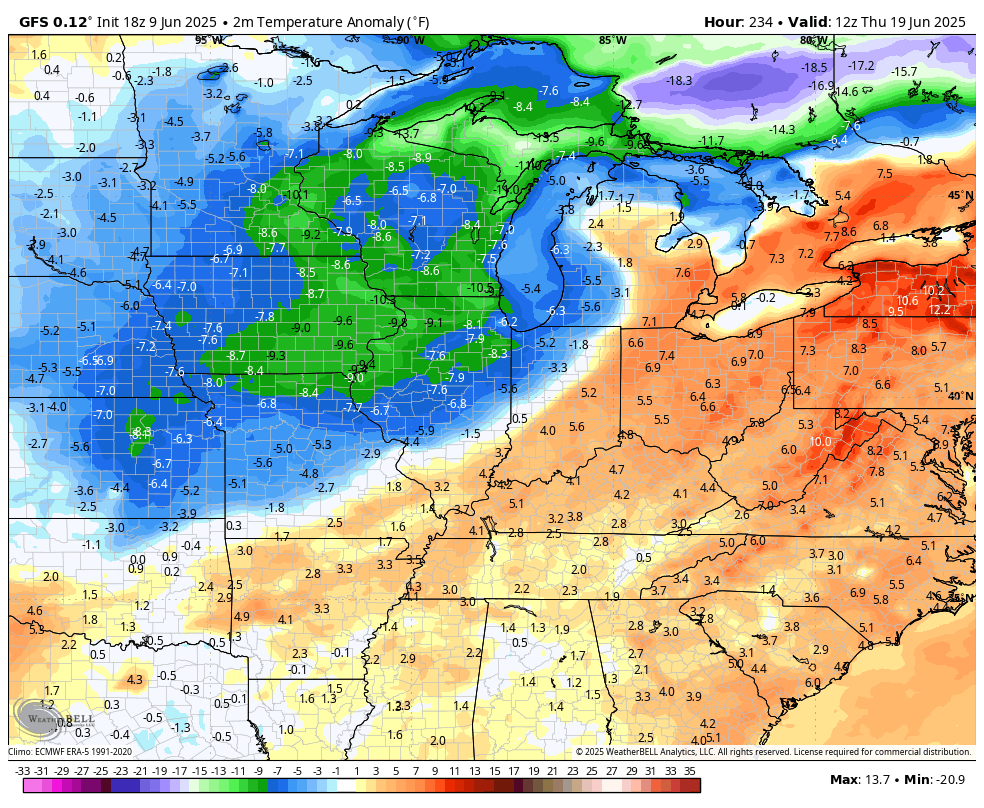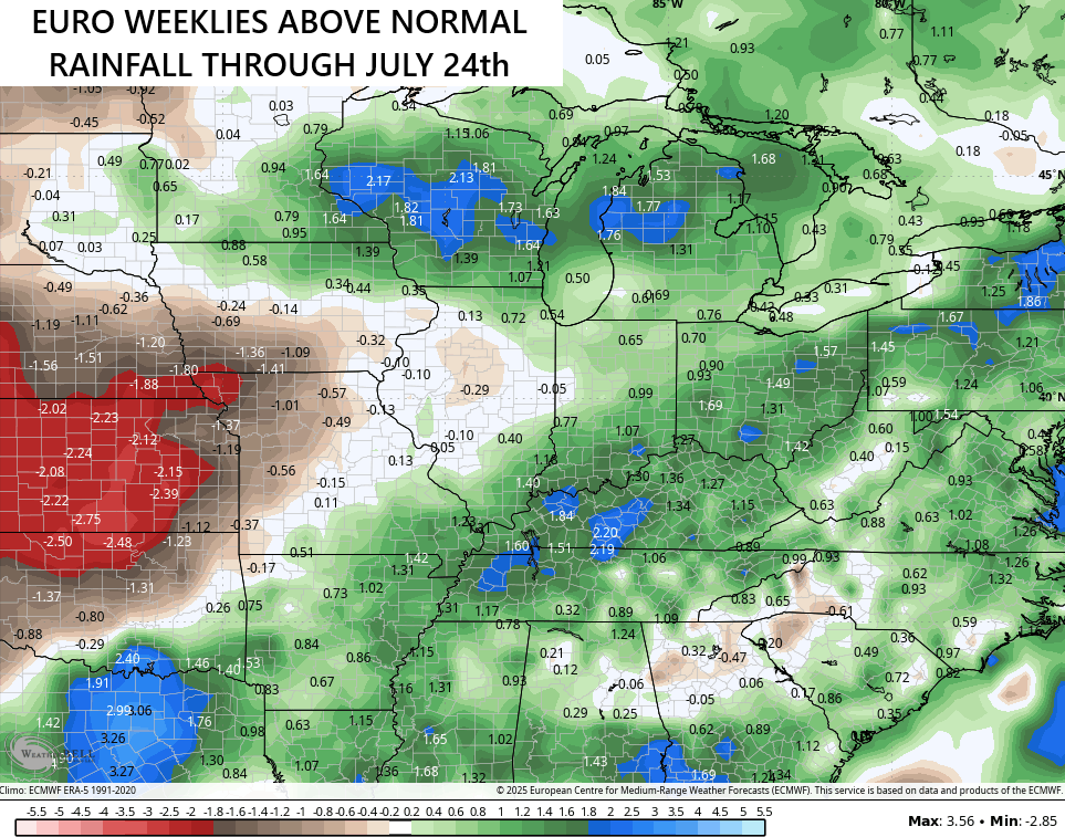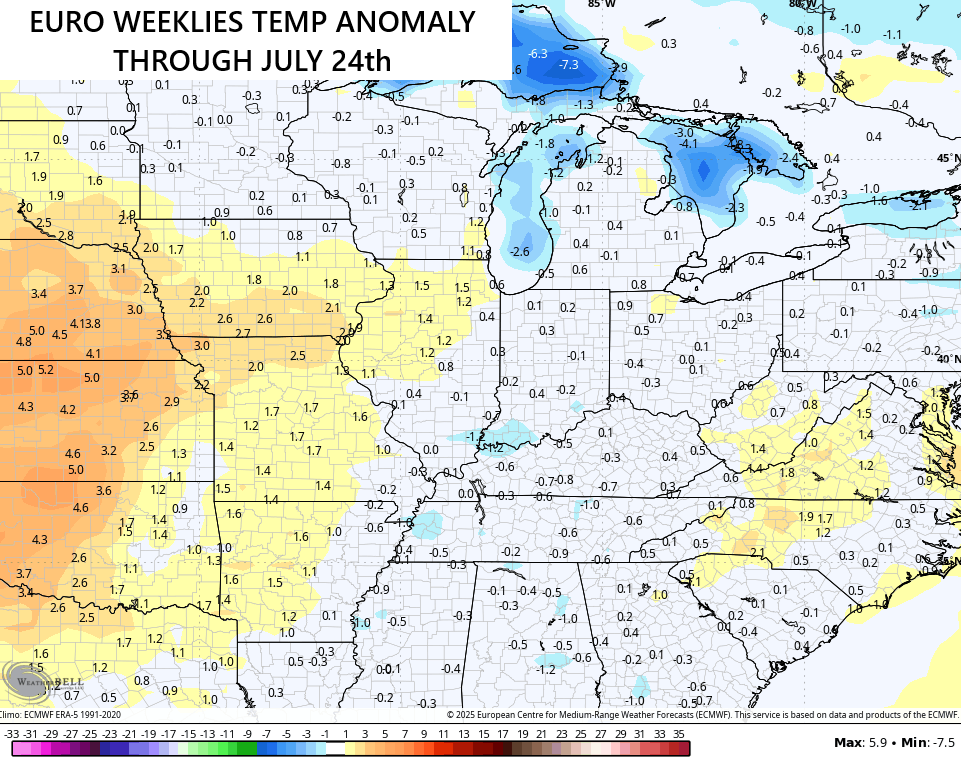 The pattern from the Euro Weeklies continues to show above normal rainfall and normal to slightly below normal temps into the second half of July…