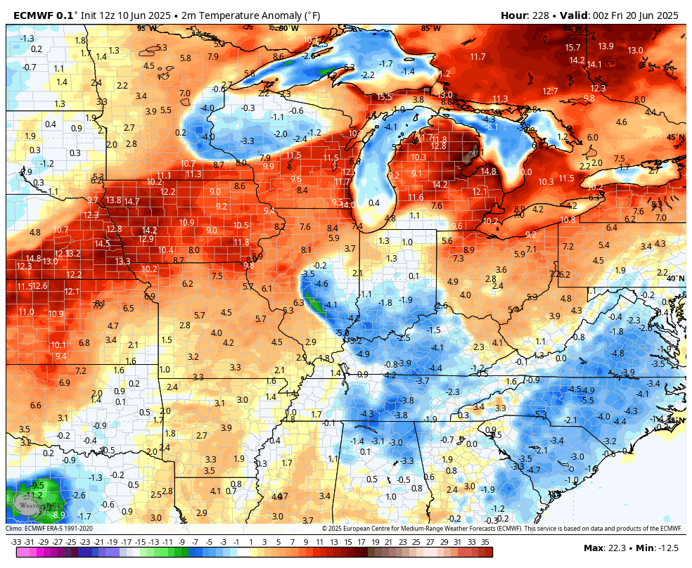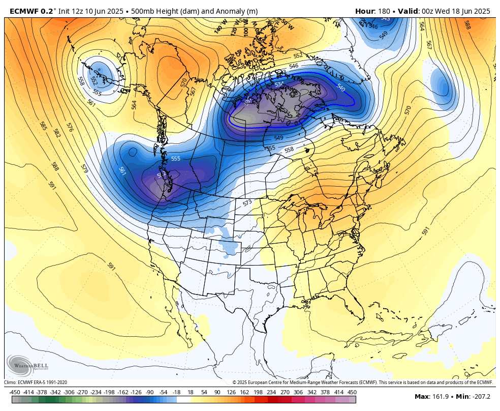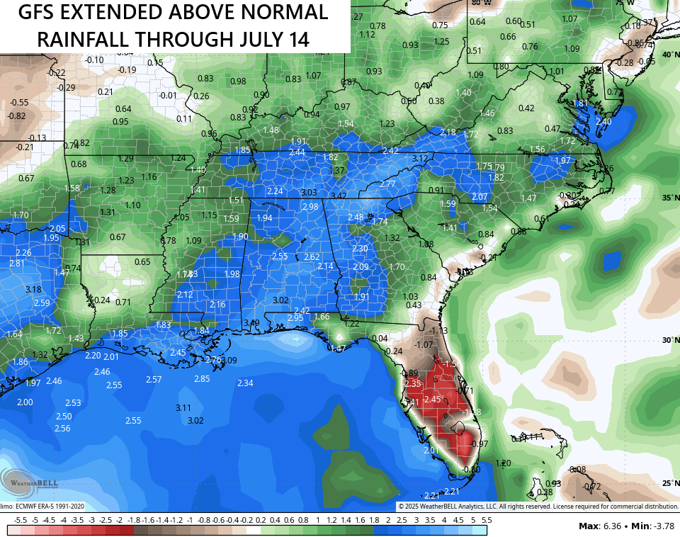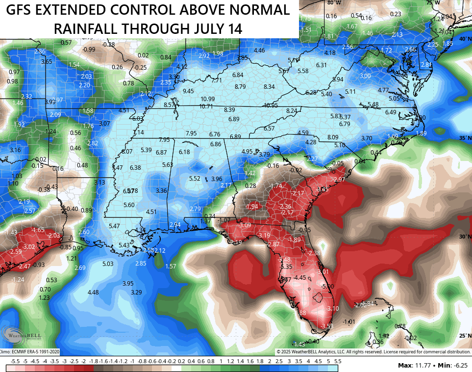 The latest rainfall forecast from the GFS EXTENDED goes through the middle of July and keeps us into the above normal rainfall area…