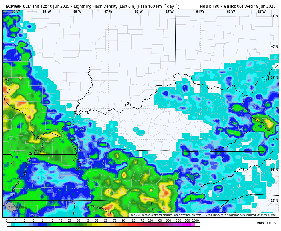 Storm chances come down a bit later Monday and Tuesday before going right back up later next week, likely continuing into the following week. Here’s the EURO…