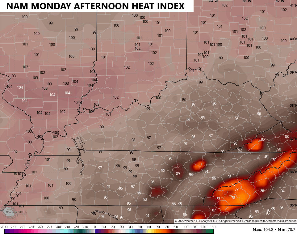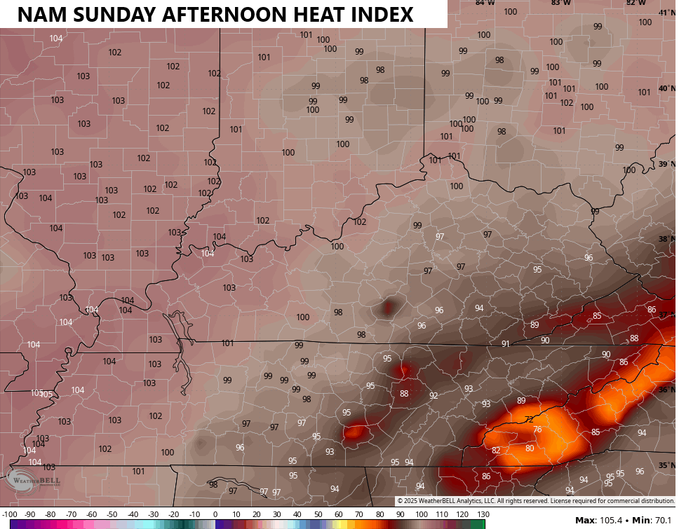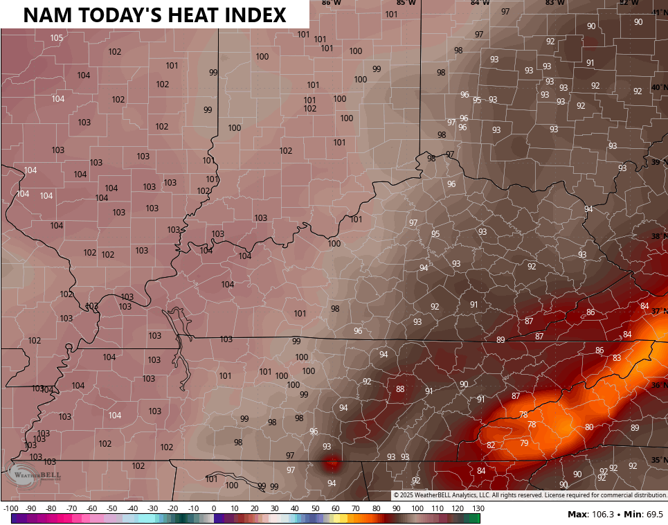 The Heat Advisory criteria around here is for a heat index of 105 for 2 or more hours. The best chance for that to happen is across western Kentucky and that’s why they have a Heat Advisory…