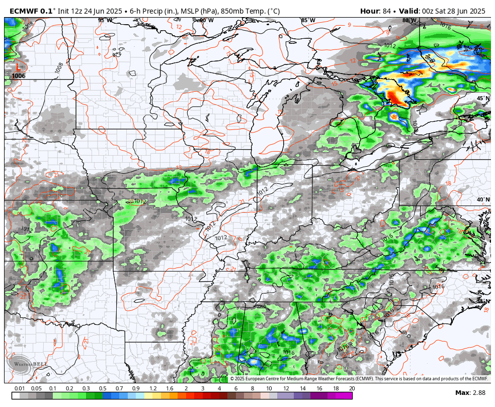Scattered showers and storms will then be more common over the weekend as temps continue to come down with most areas 85-90. Showers and storms will then become likely early next week as a cold front approaches from the west. That front closes out the month with showers and storms and will also begin July with some showers and storms. Better air should come in behind this by Wednesday or so…