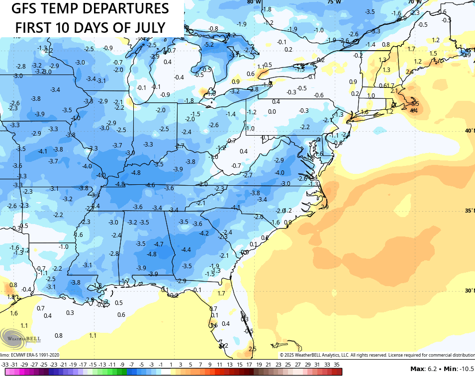 The models continue to trend toward a cooler than normal setup for early July with the GFS going all in on much cooler than normal for the first 10 days of the month…
