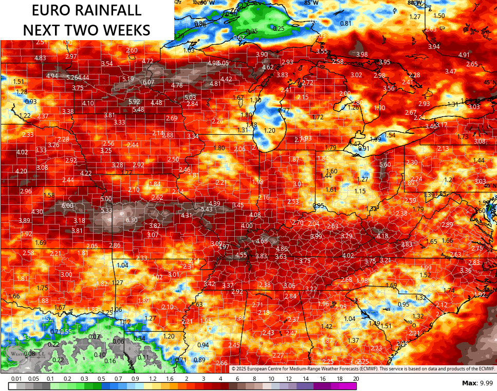 That run of the EURO is seeing some hefty rain totals over the next few weeks…