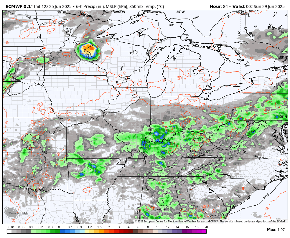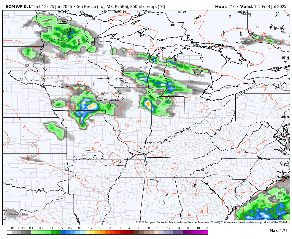 Temps should be pretty pleasant for early July, but can we hold off the storms for the 4th? That’s what we are hoping for, but the potential for storms will crash back in around the 4th or, perhaps, just after. Watch how the EURO brings clusters of showers and storms dropping in here from the northwest from late on the 4th into the following week…