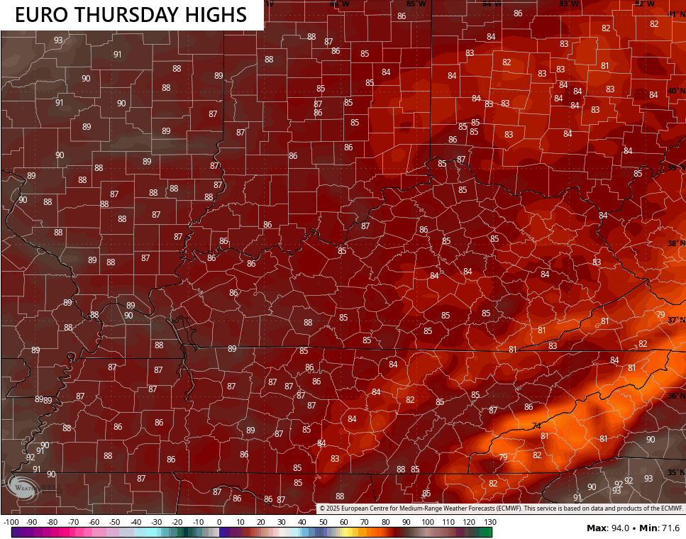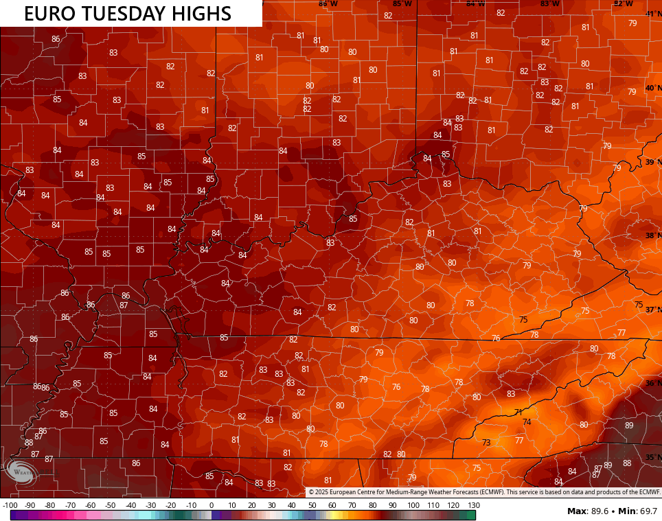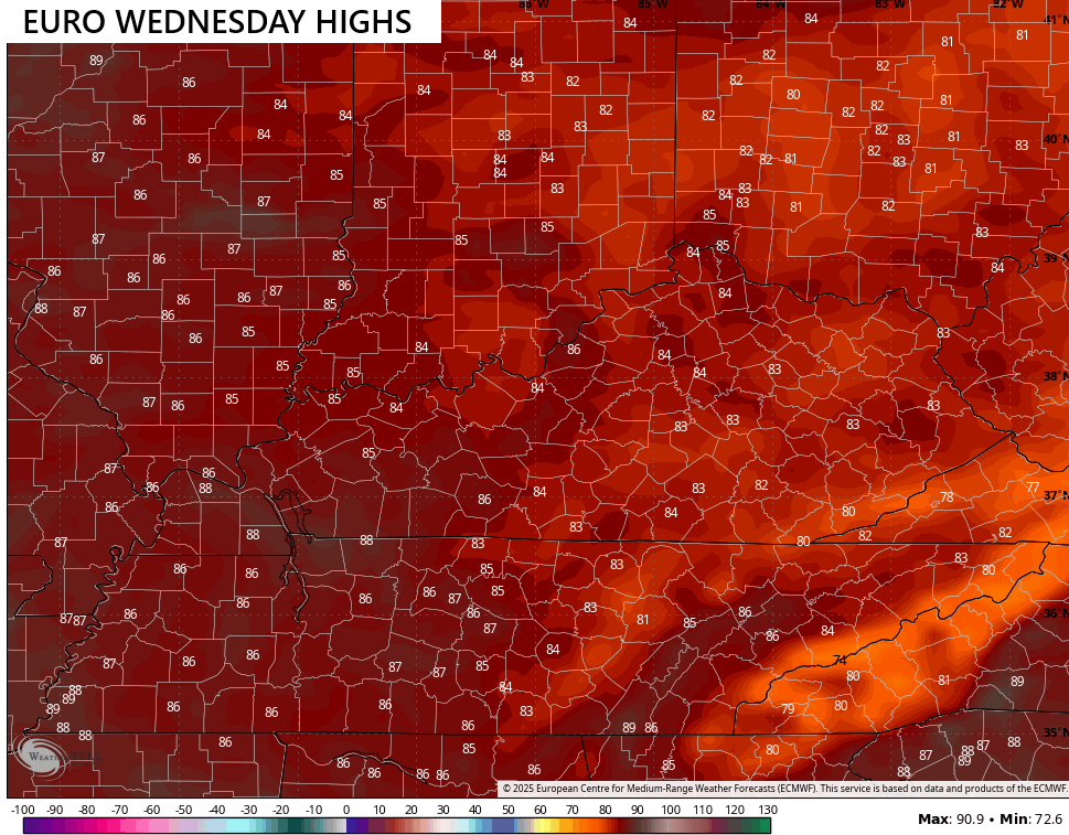 Wednesday’s temps look really, really good with low and middle 80s for most…