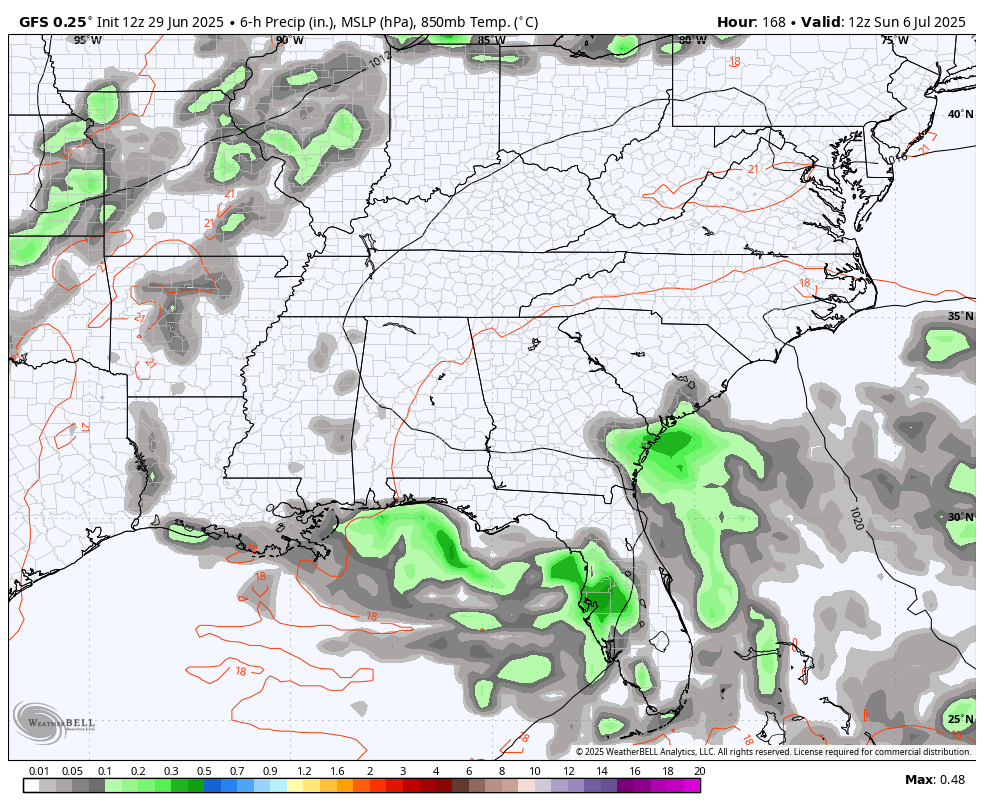 Temps should hover around 90 next weekend with additional showers and storms rumbling in. This would be ahead of another pattern that delivers a few cold fronts into the region next week. At the same time, some tropical juice from the Gulf may try to get involved…