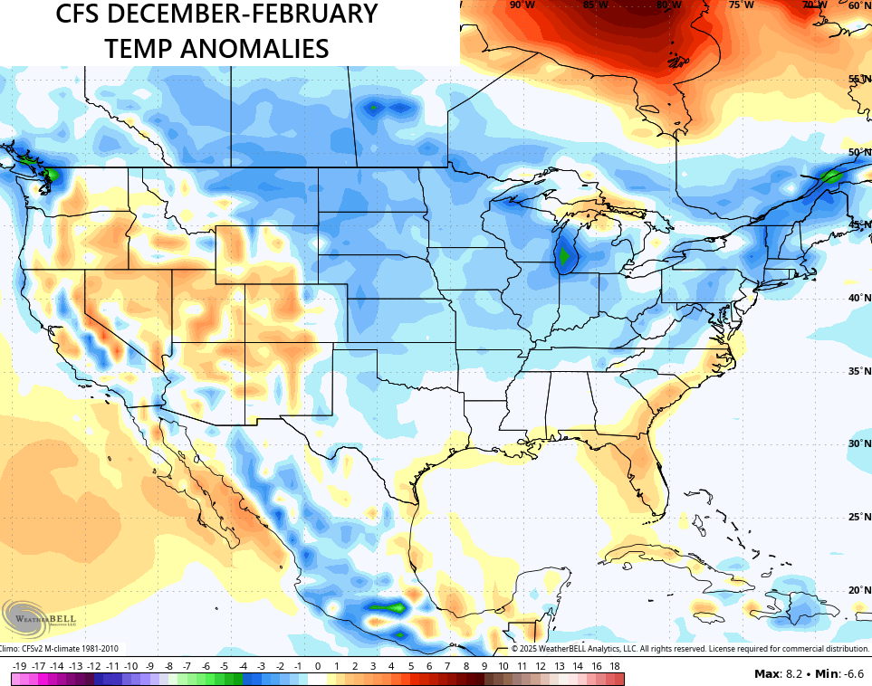 If you’re already longing for winter, the average of the last 10 days worth of runs from the same CFS is showing a colder than normal winter…
