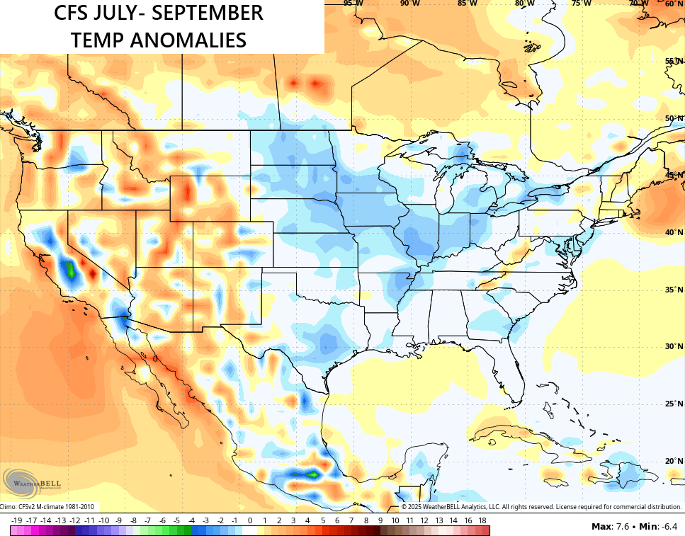 Looking even longer range with the CFS, we find the last average of the last 10 days worth of model runs showing normal to slightly below normal temps through September…