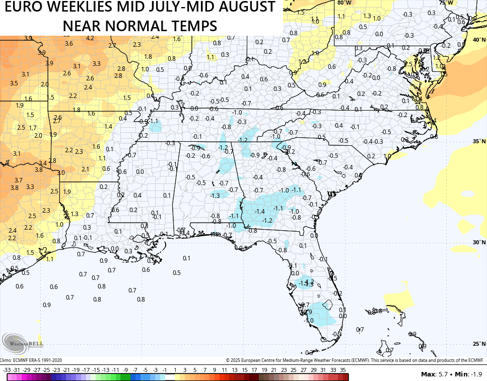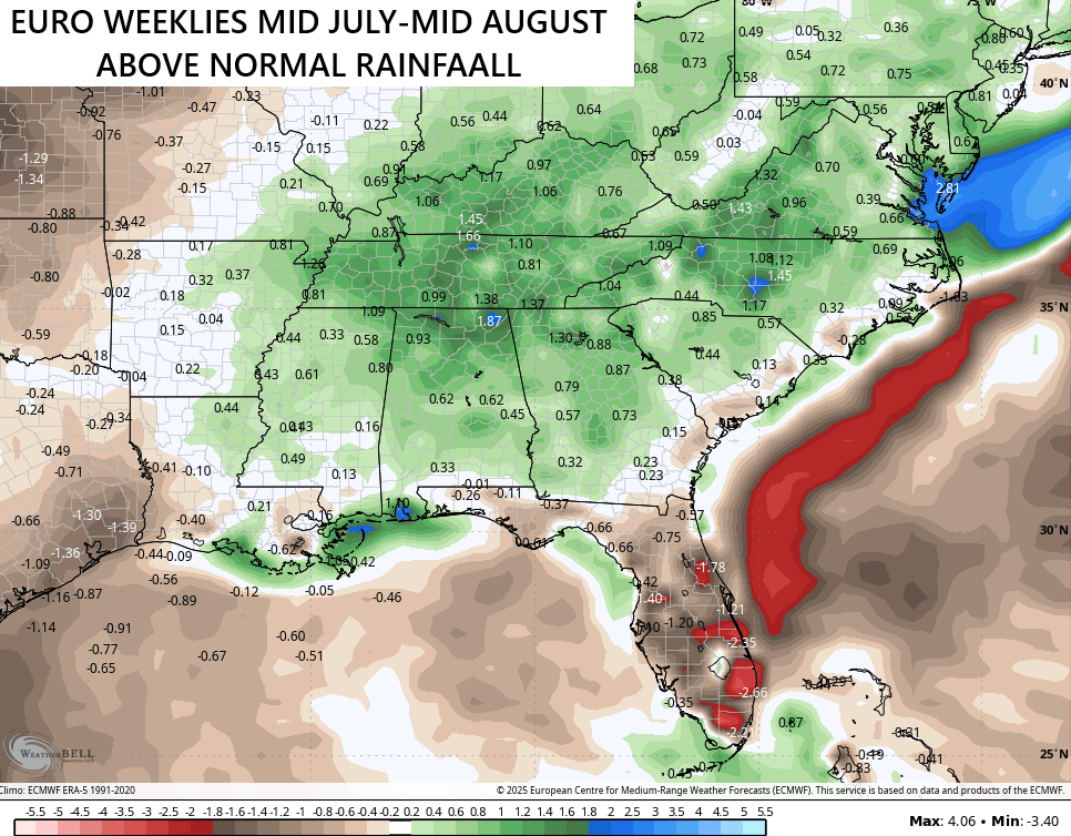 Looking farther down the road is now looking a lot like what the GFS Extended has been showing of late. Check out the mid July to mid August area of above normal rainfall from the Gulf into our region…