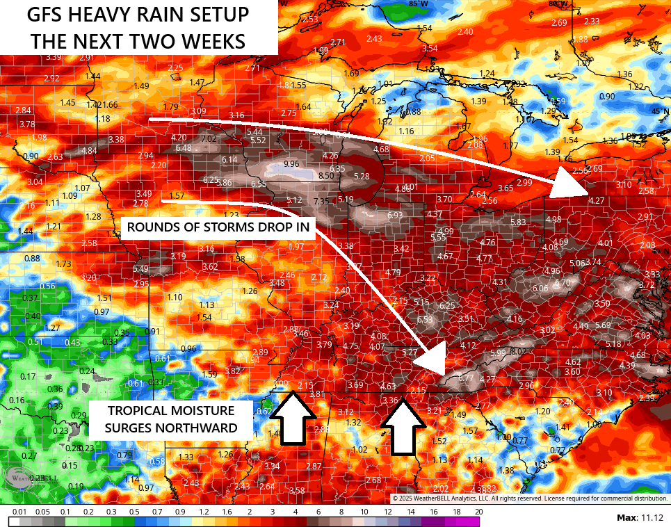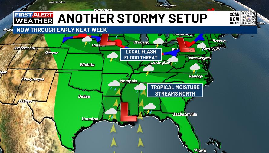 Good Tuesday, everyone. It’s another active weather day as torrential rain producing showers and storms rolling across Kentucky and this pattern is just getting started. Rounds of storms will increase, bringing an increase in the potential for flash flooding over the next week or so.