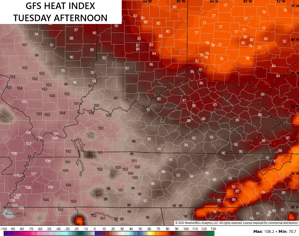 This boundary will still spit out a few showers and storms into Tuesday as it slowly becomes more diffuse. To the south and west of his boundary, it’s the swamp with a heat index today around 105 in the west. That looks to be with us again Tuesday with much better air in the central and east…