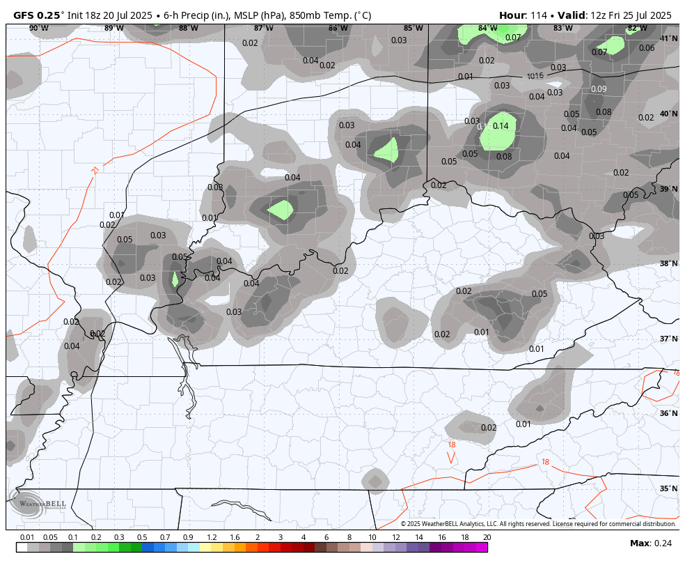 Notice the cooler spots in the east? That’s because isolated showers and storms go up during the afternoon and evening. By Friday, more in the way of scattered showers and storms join in on our steam bath and those look to go through the weekend into early next week.