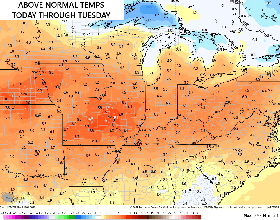 Isolated storms continue out there today with temps in the upper 80s and low 90s. This sets the stage for widespread 90-95 degree high temps this weekend through Tuesday. Overall, temps for our entire region average well above normal…