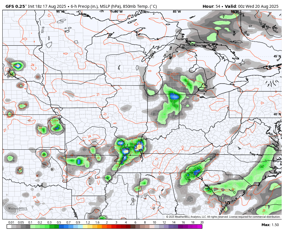 Similar conditions will be noted Tuesday as we get set for a cold front to drop in for Wednesday. This touches off showers and thunderstorms across the region and a few of those hang around into Thursday and Friday as temps come down several degrees from where they are to start the week.