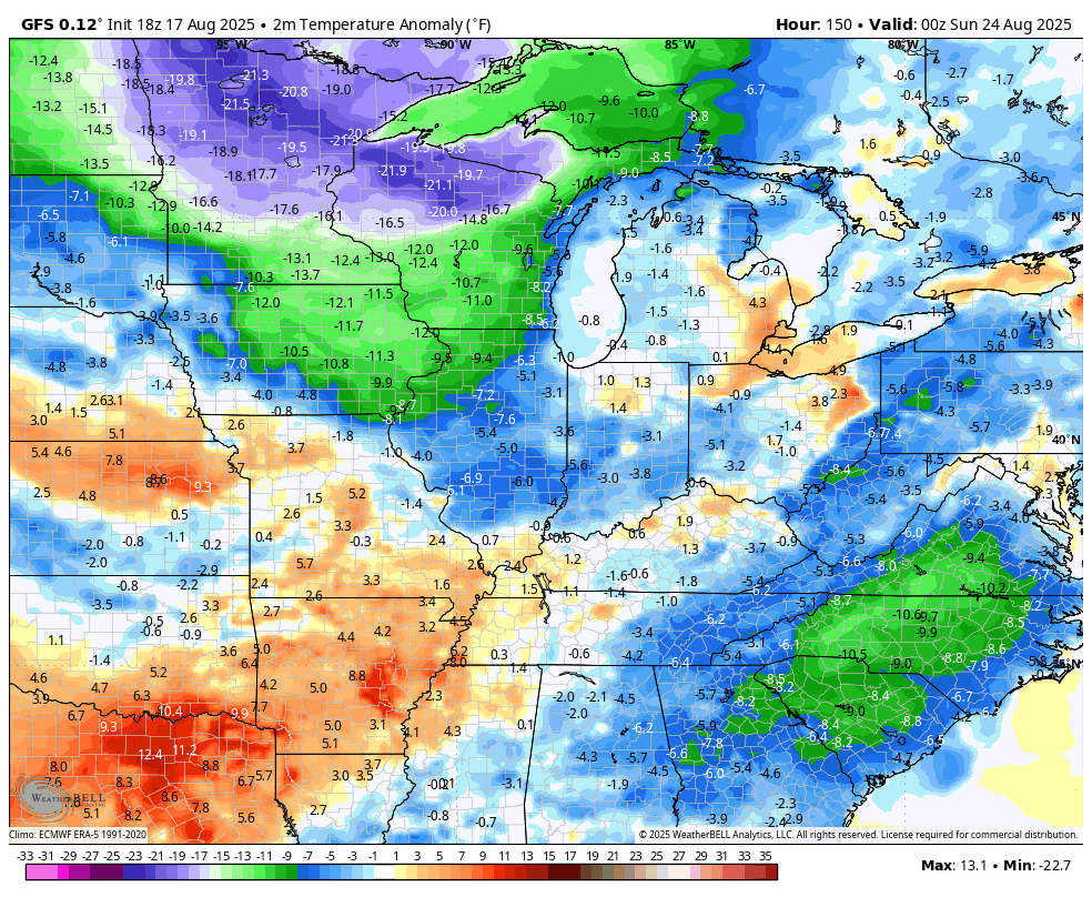 Temps go well below normal with some Barney colors showing up into early next week. This temp departure from normal animation starts Sunday and goes into Thursday…