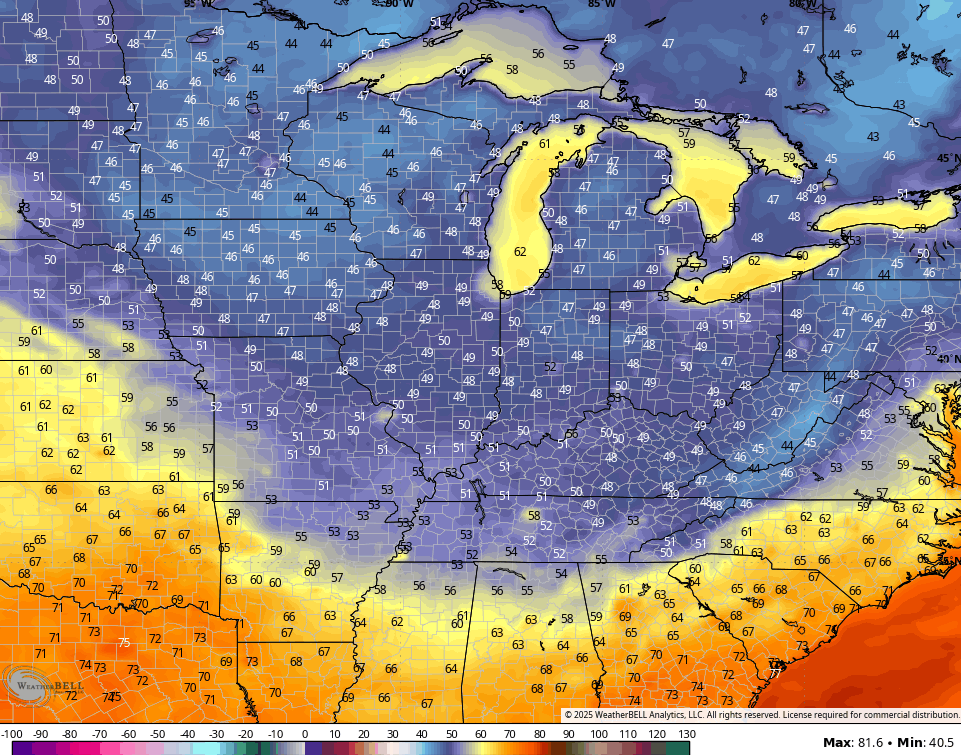 Some recent runs of the GFS take lows way down there by early next week. Upper 40s might be a stretch, but I can’t say there’s no chance of this verifying…
