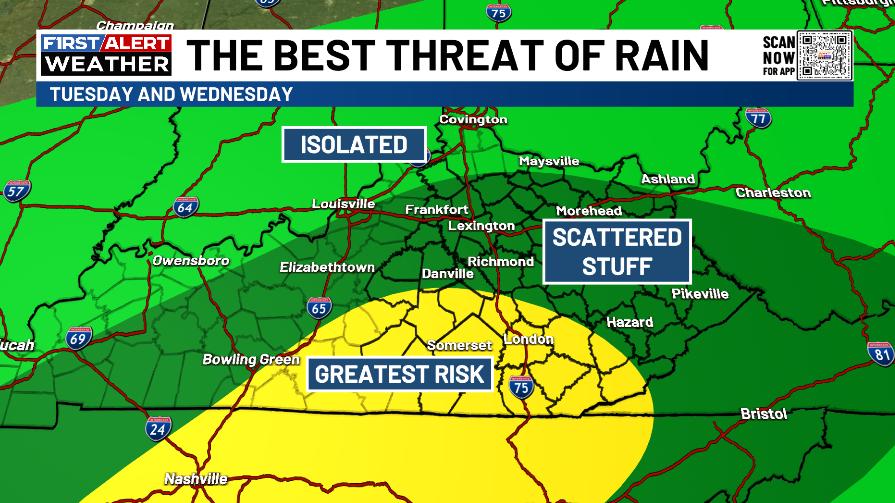 Today’s action is rather scattered for much of the state, but there’s likely a greater concentration across areas of southern Kentucky. This continues into Wednesday, as well. Here’s a look at who has the greatest risk of beneficial rains today and Wednesday…