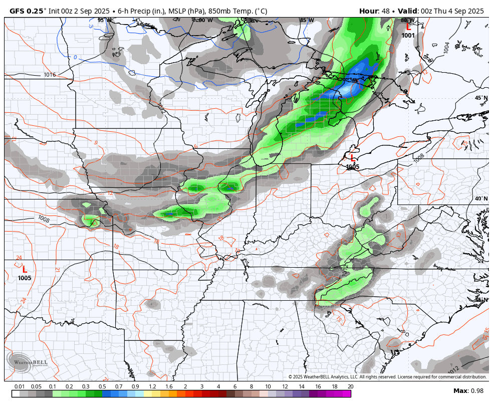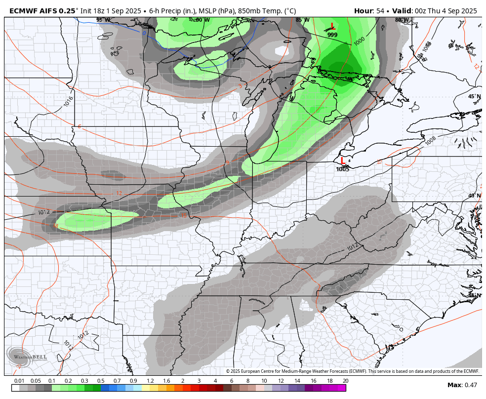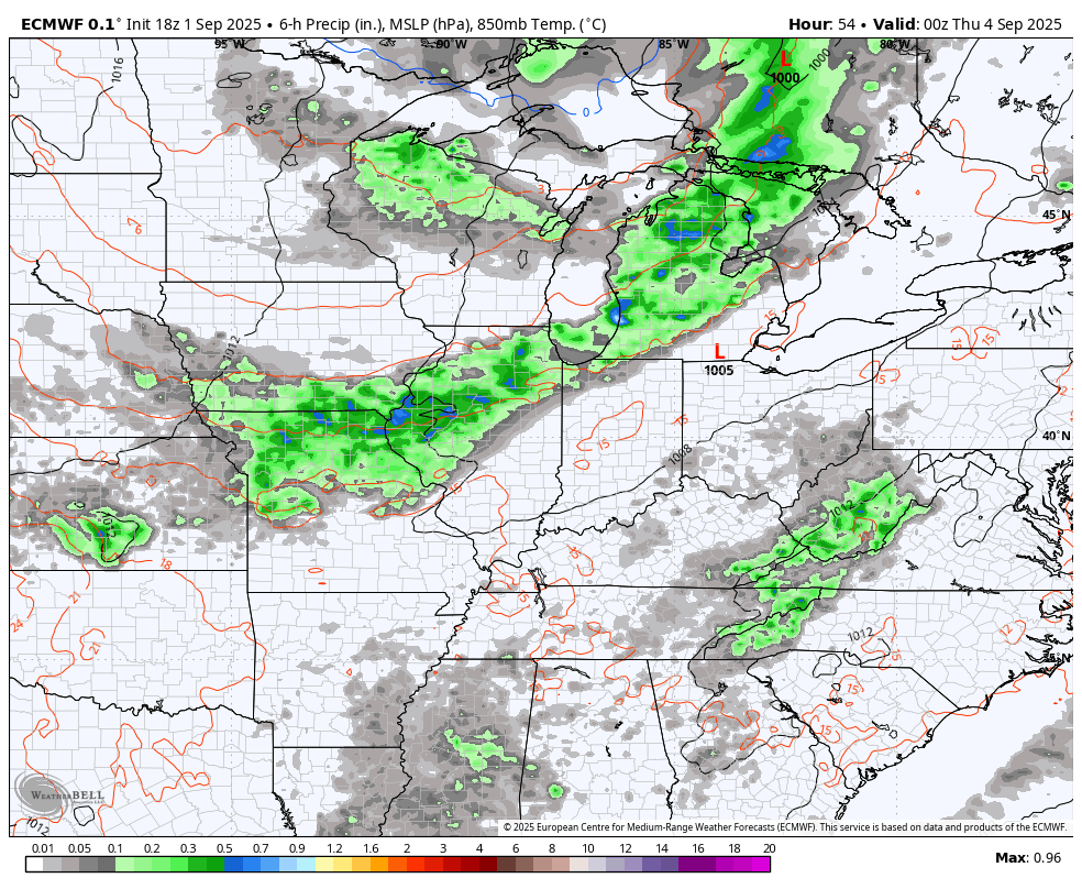 The first of two fall cold fronts arrives in here with a broken line of showers and storms for Thursday with another bringing a similar line on Saturday. The EURO has a good look at these fronts…