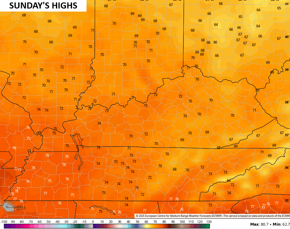 Highs Sunday generally hang out in the upper 60s to low 70s for central and eastern Kentucky and 70-75 in the west…