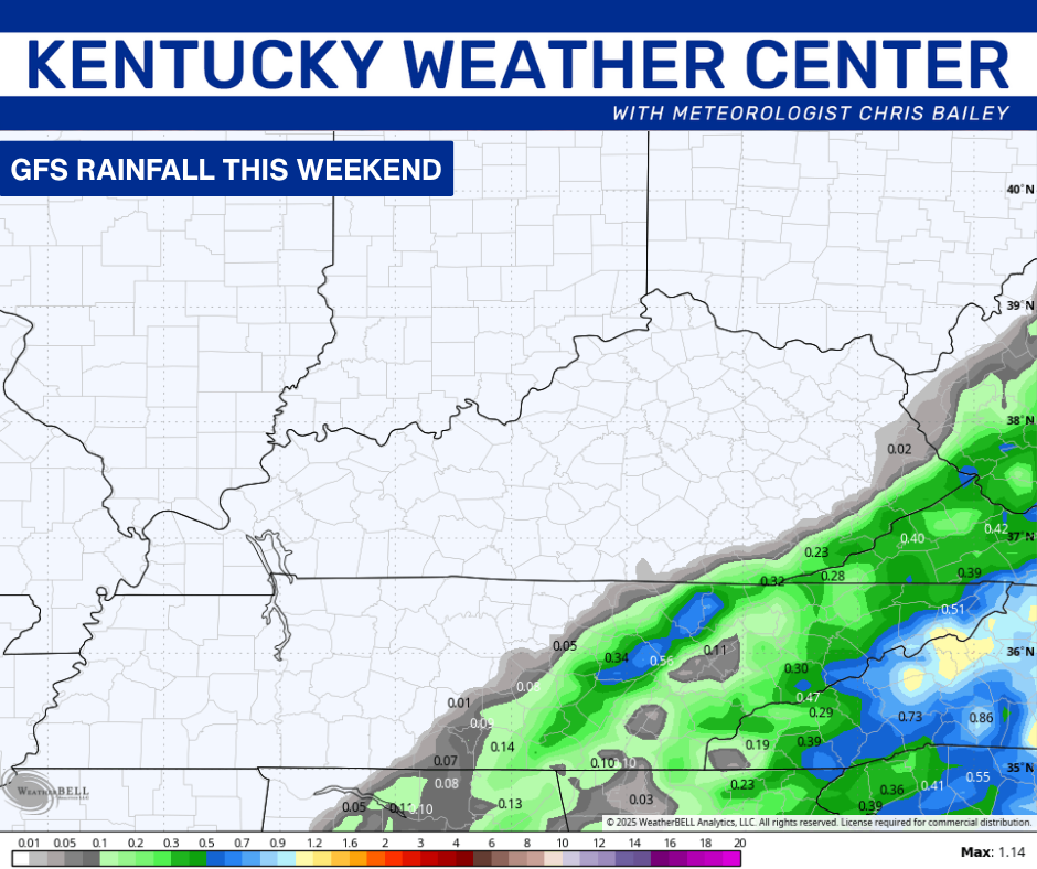 Before we get there, there’s still quite a bit of moisture spinning to our east and southeast today and some of this may get pushed back west. That could bring some showers and rumbles of thunder into far southeastern Kentucky.