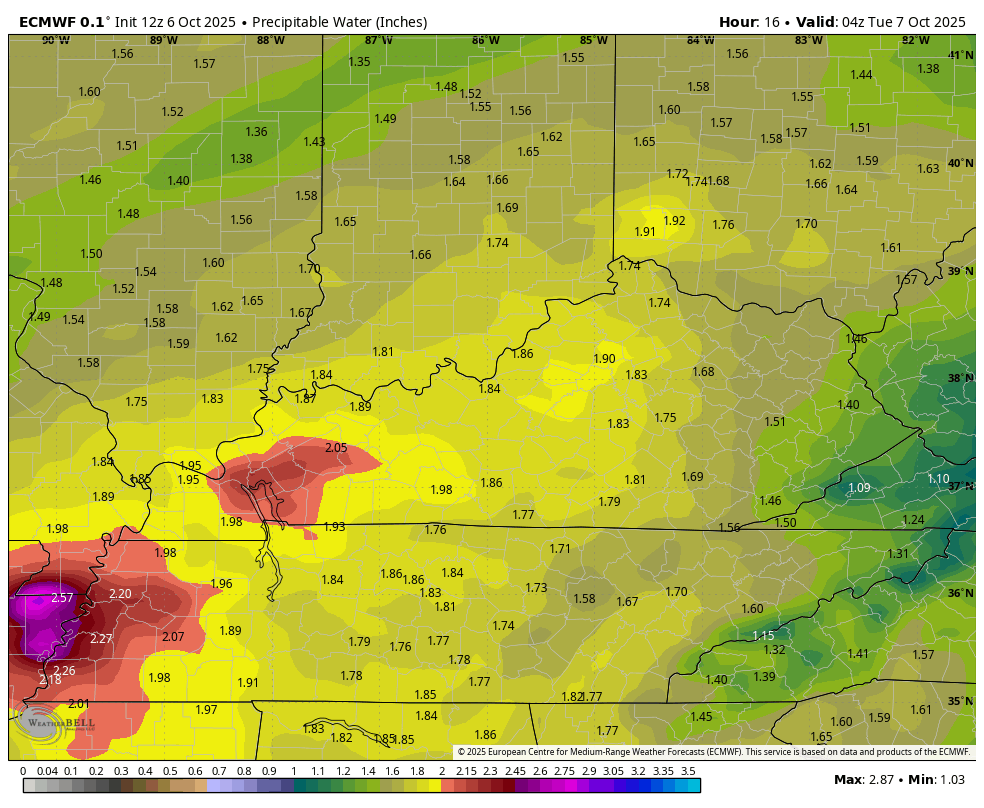 The amount of moisture we are seeing with this system is very out of the ordinary. Precipitable Water values going above 2″ in October usually comes from the leftovers of a tropical system, but that’s what we will see Tuesday.