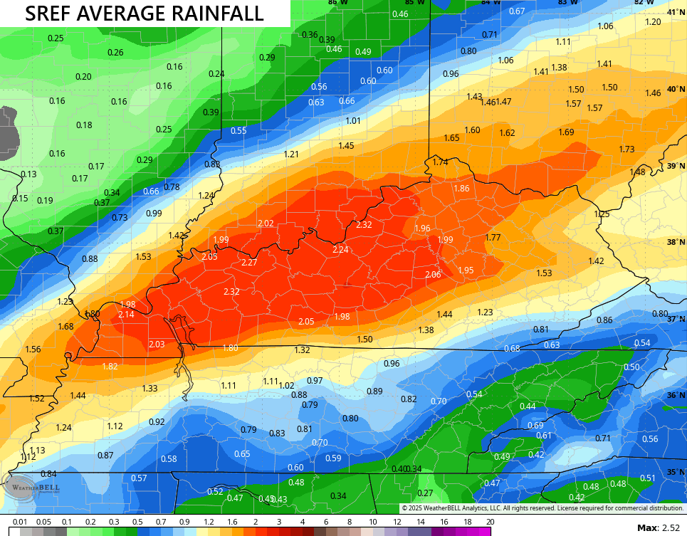 The forecast models have been pretty beefed up with the corridor of heavy rains that will likely fall along and just to the north of the track of our low. The average of the 26 members of the Short Range Ensemble Forecast model looks like this…