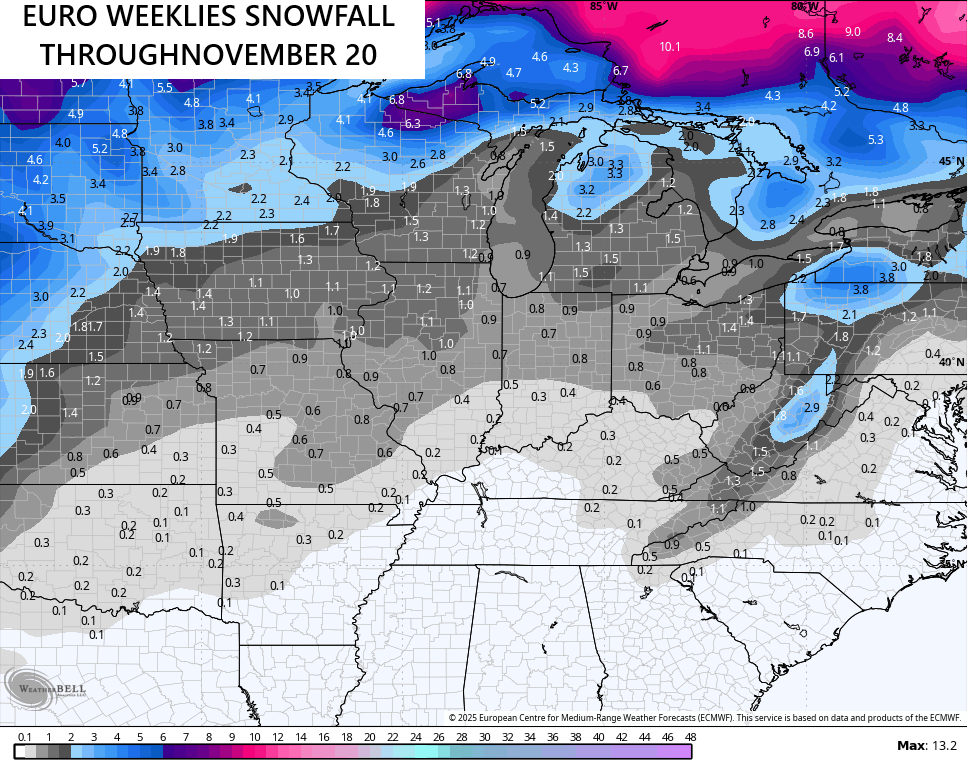 The EURO Weeklies also like this potential. The latest snow map goes through November 20th and shows some flake chances…