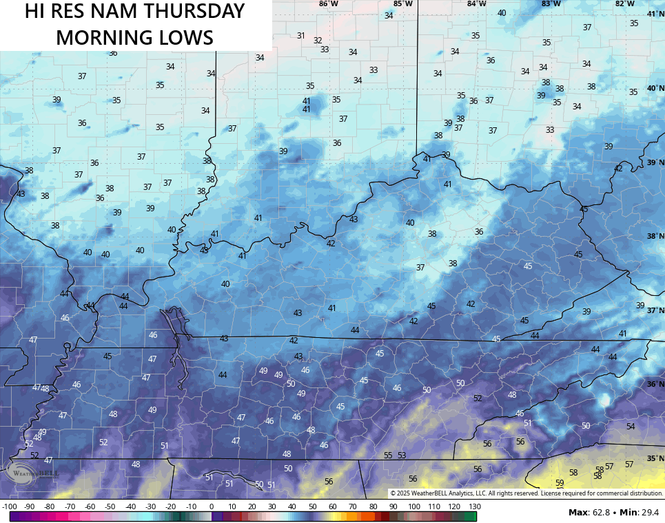 Highs Thursday are mainly in the mid 60s for many with the numbers pushing 70 in the west. Mid 60s to low 70s will be common this weekend for highs with lows reaching the 40-45 degree range with pockets of upper 30s on clear nights.