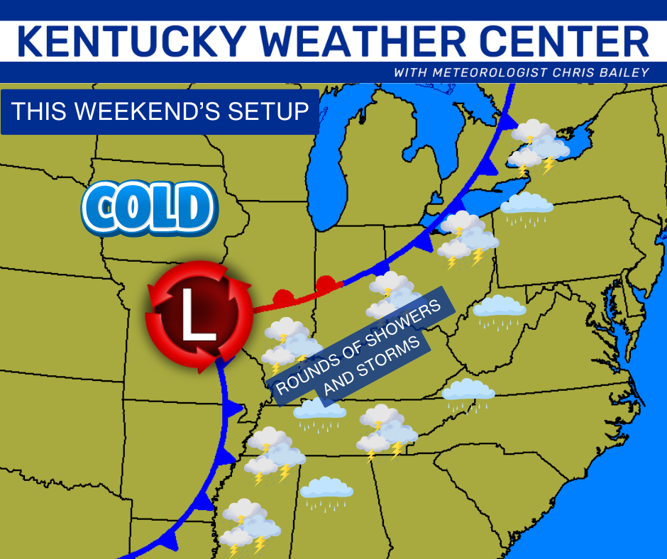 A potent storm system rolls from the Rockies and into the northern Plains this week. That drags a cold front toward us as another low pressure develops along the boundary. This low then spins into our region from the west over the weekend…