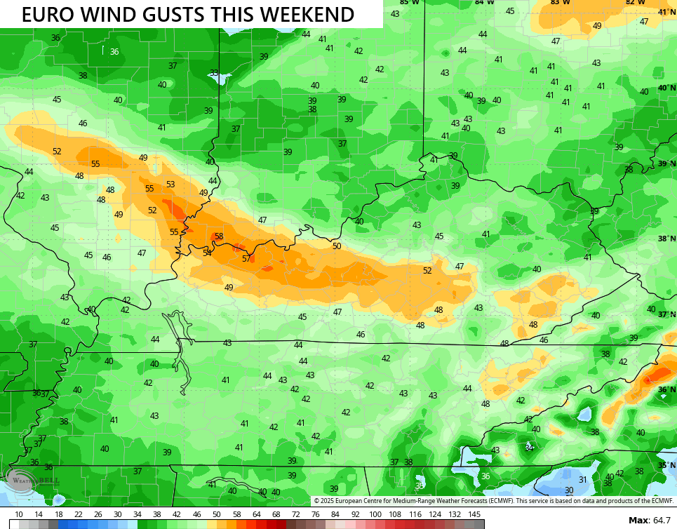 The EURO has a swath of some big time winds behind the departing low…