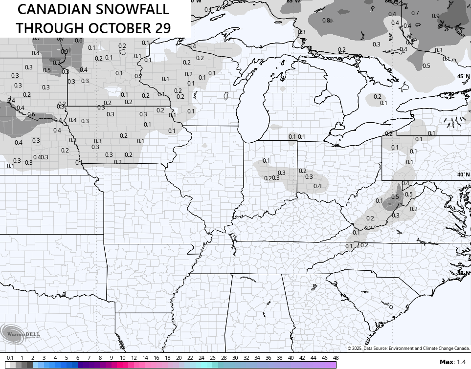 The signal has been there for a little while for a late month trough to dig into the eastern half of the country in the last week of the month. The Canadian Ensembles even see some flake action nearby in the closing days…