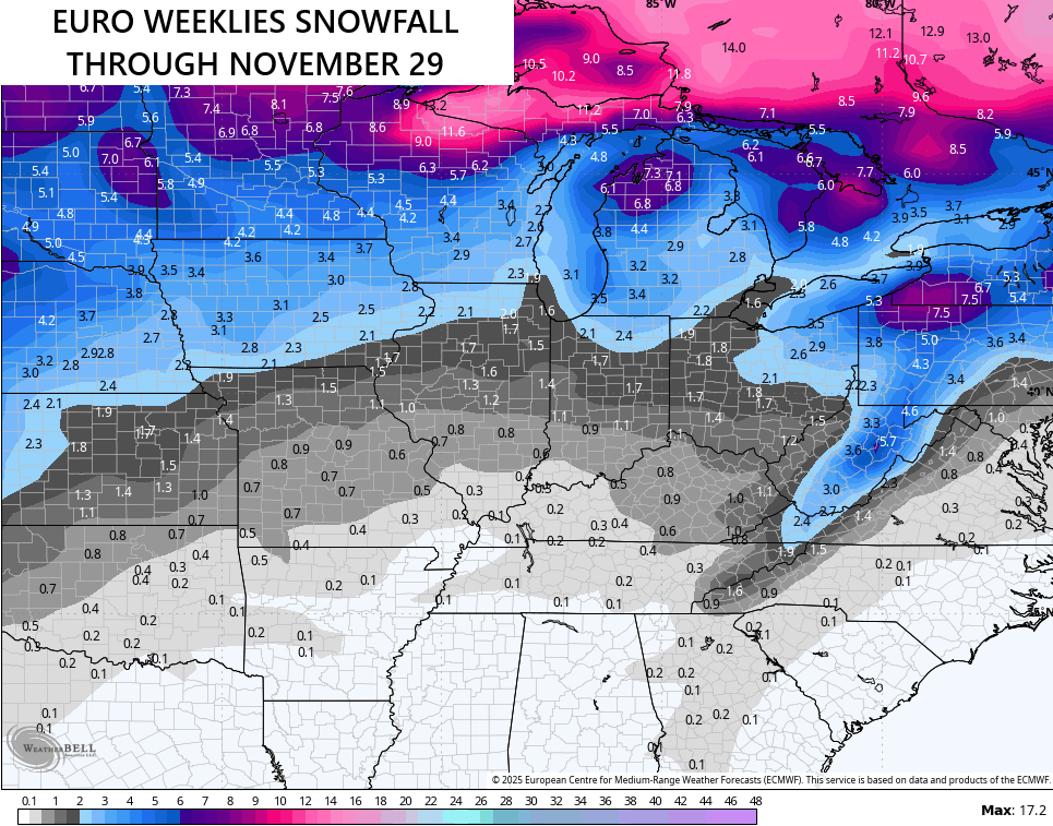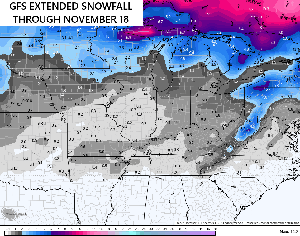The upslope look in the snowfall along the Appalachian Mountains suggests some pretty strong and cold northwest winds from time to time. We saw this last November and last year continues to be my number 1 analog for the upcoming winter!