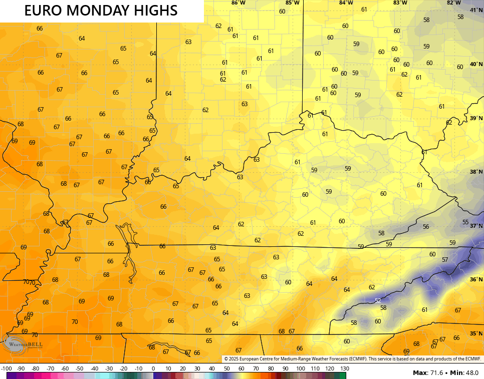 - Temps drop into mid and upper 50s for central and eastern Kentucky.