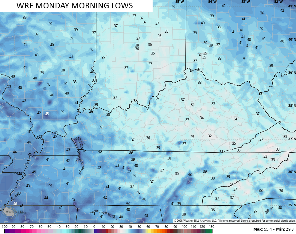 The WRF has had the “hot hand” when it comes to our cold nights of this early fall season. It currently has the coldest Monday morning lows with some areas reaching the middle 30s…