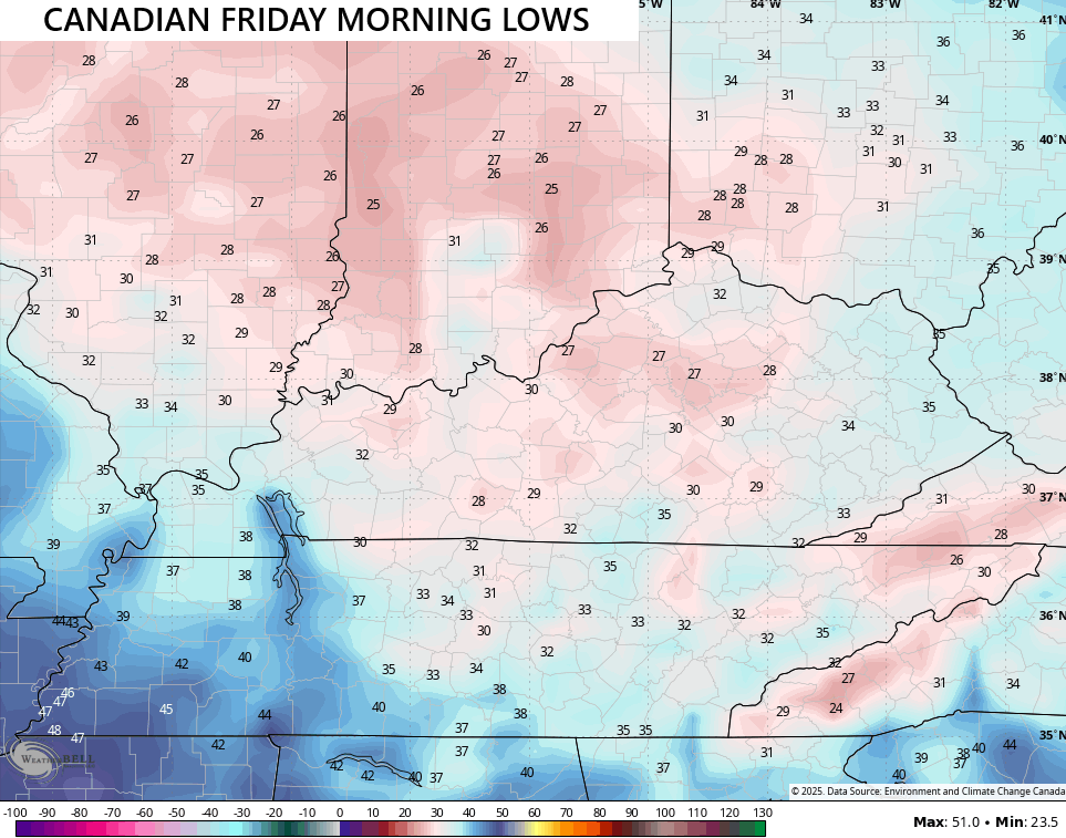 Those winds are blowing much colder air into town with the potential for patchy frost Wednesday morning and the chance for widespread frost Thursday and Friday mornings. The Canadian Model continues to throw below freezing temps at us Friday morning…
