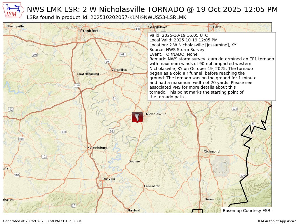Before we look ahead, let’s look back at our Sunday and a weak tornado that touched down just west of downtown Nicholasville. This wasn’t your typical tornado as it came from a cold air funnel that actually touched the ground for about a minute. Here’s the information on the EF-1 tornado…
