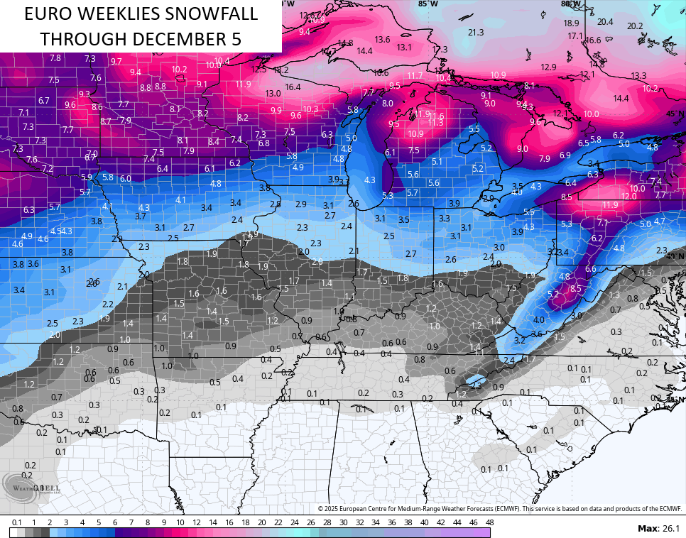 In terms of this trough possibly producing early season winter weather around here, you already know I’m pretty keen on the chance for early season flakes. The total run of the EURO Weeklies through December 5th look like this…