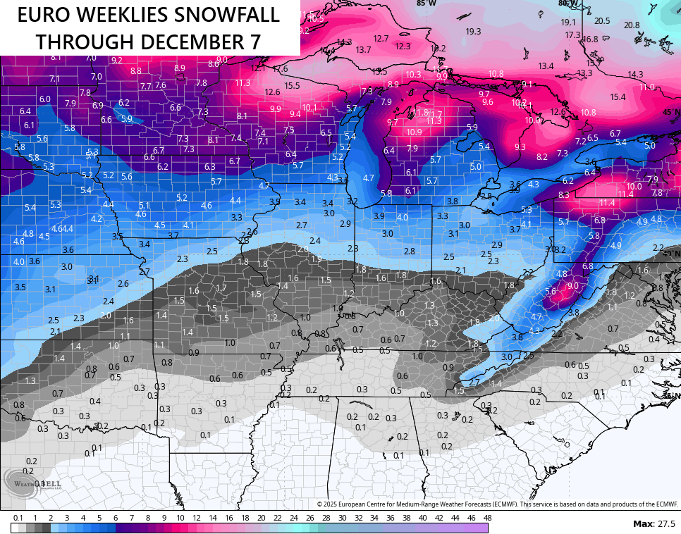 Looking at the latest snowfall potential from the EURO Weeklies, we find a decent look for this early in the year…